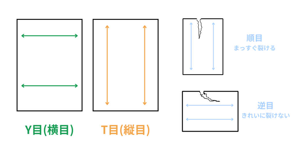 用紙には繊維の流れる方向があり、これを流れ目と呼んでいます。流れ目には紙の長辺に平行なT目(縦目)と短辺に平行なY目(横目)があります。用紙は流れ目と平行方向に沿って、破りやすい・折りやすい・反りやすいです。用紙の流れ目は使用用途によって仕上がりに大きく影響するのできちんとその特性を把握しておくことが重要です。