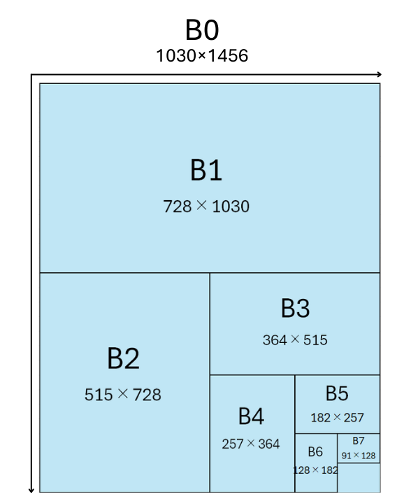 A判・B判ともに、A0・B0の半分のサイズがA1・B1、その半分がA2・B2というようにそれぞれの面積比の半分になっていきます。(四六判、菊判、ハトロン判も同様)