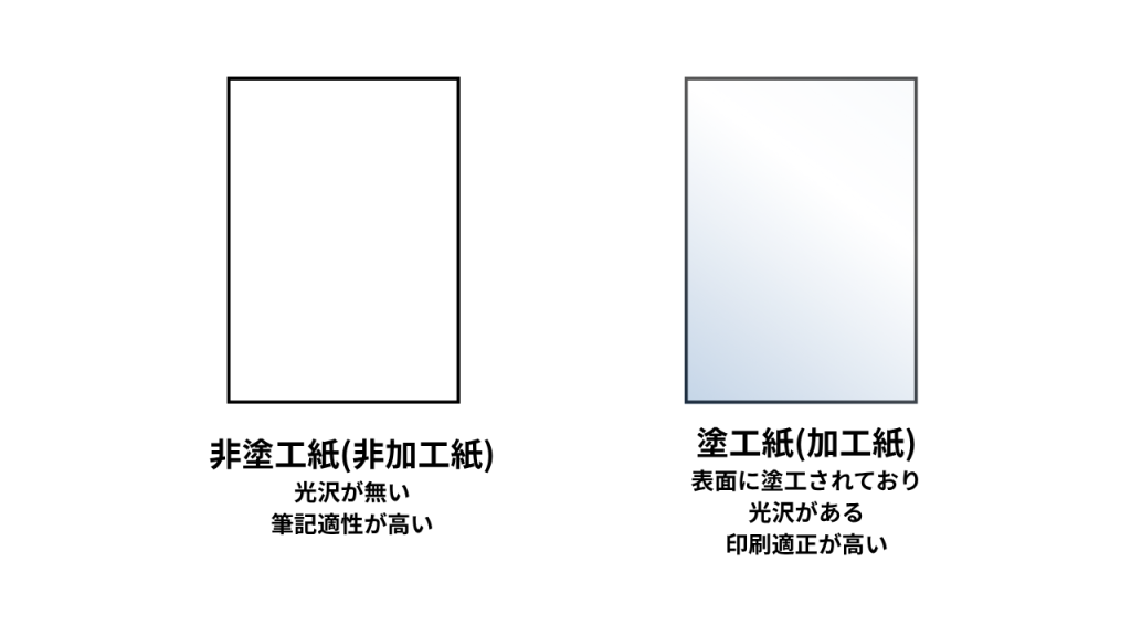 印刷やコピーに使われる用紙は表面加工の有無で「非加工紙」「加工紙」の2種類に大きく分けられます。はじめにこの「非加工紙」と「加工紙」の種類をみていきましょう。