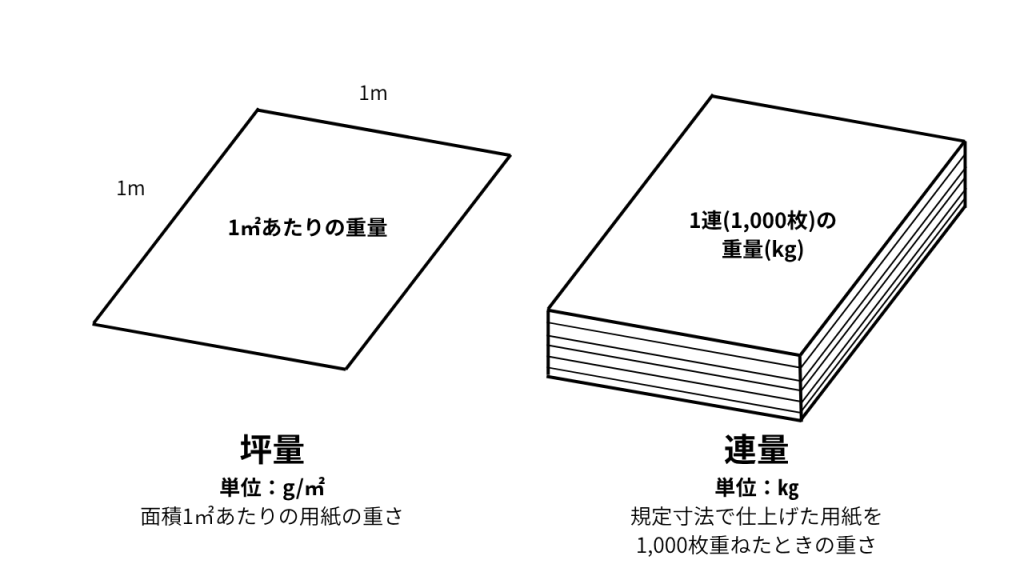 坪量は「紙1㎡の重さ」で、数字が大きいほど紙が厚くなります。世界的にも使われている、わかりやすい基準です。