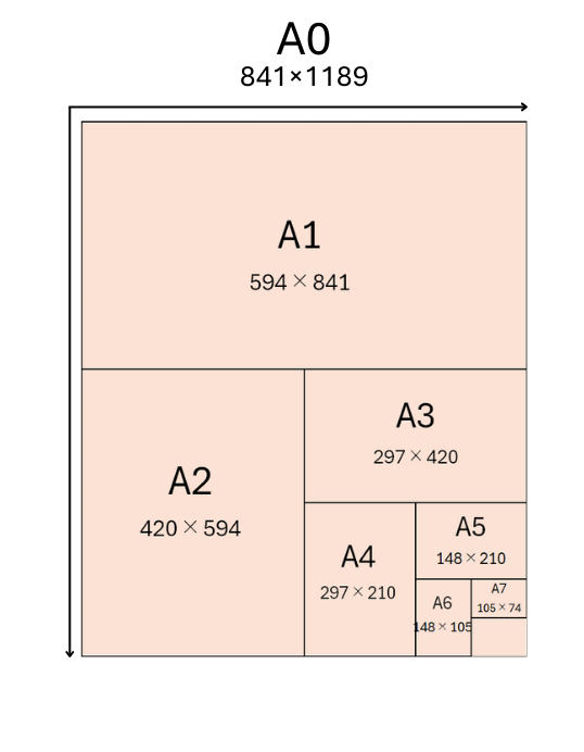A判はJIS(日本工業規格)における寸法の一つで、また、ISO(国際標準化機構)の規格とも一致しています。A列の中で一番大きいのはA0(841×1189㎜)です。