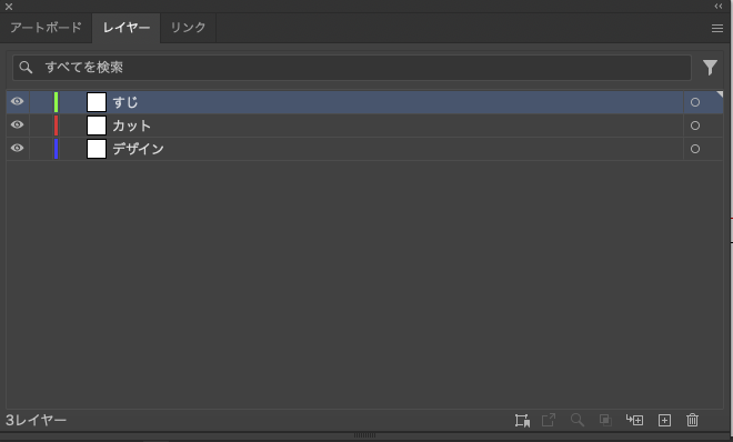 カットするレイヤー(M100%)、スジのレイヤー(ある場合)(C100%)、デザインのデータ(4C)と分けておきます。