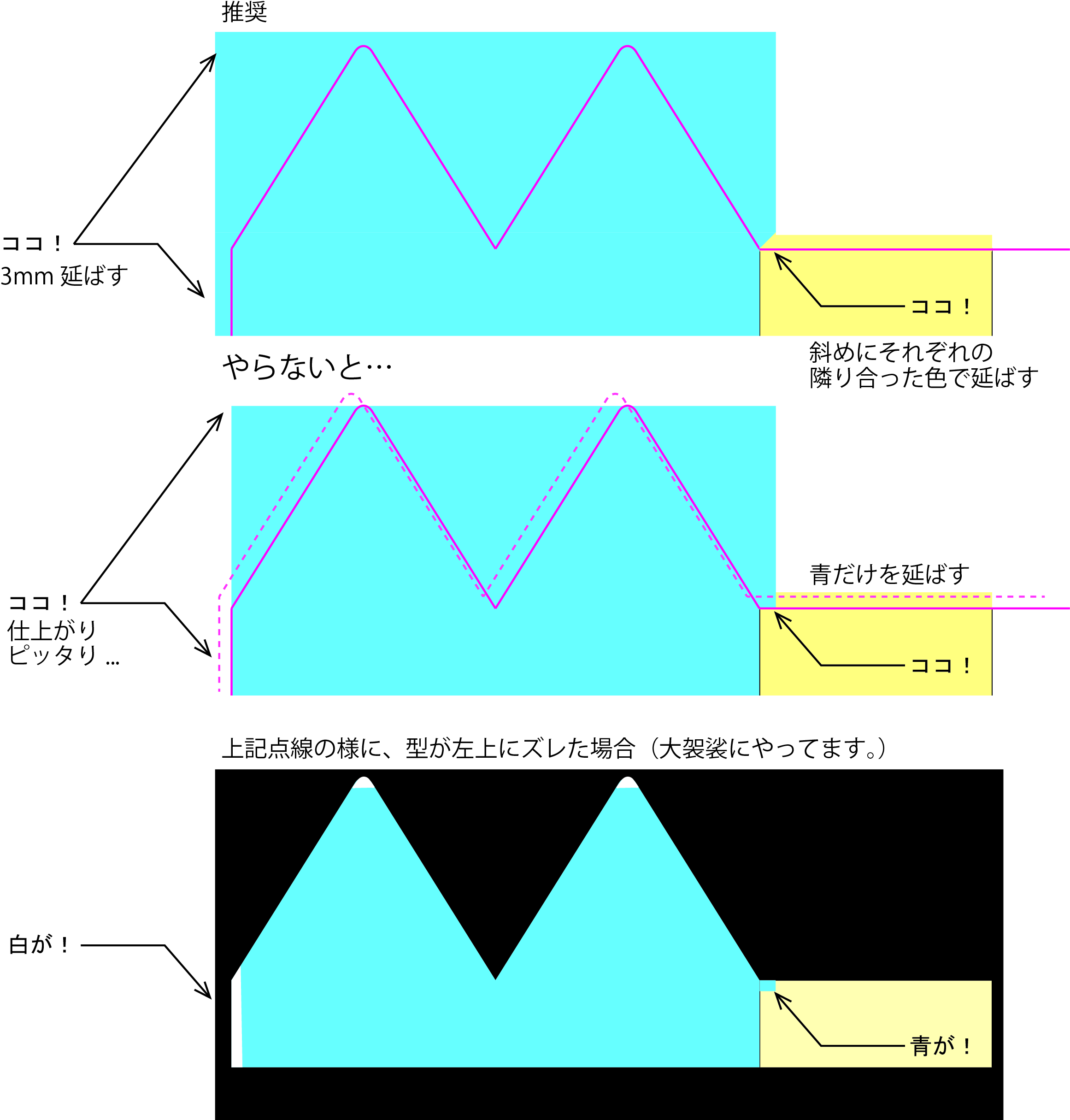 ポイント:デザインが仕上がり線のギリギリにあると、印刷後の断裁時にわずかなズレが生じ、用紙の地色(白)が見えてしまうことがあります。これを防ぐために、デザインを仕上がり線(カットライン)から外側へ3mm以上伸ばす作業を「塗り足し(ドブ)」といいます。これは印刷データ作成において最も重要なポイントの一つです。色の境目があるデザインでも、同様に塗り足しを適用することで白を防ぐことができます。